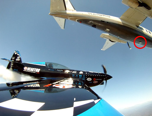 This photo shows two time World aerobatic champion Rob Holland in his MXS-RH pulling below my aircraft, showing the Eagle360, in the red circle, attached to the belly. Go here to see the "Air to Air" video from this flight!